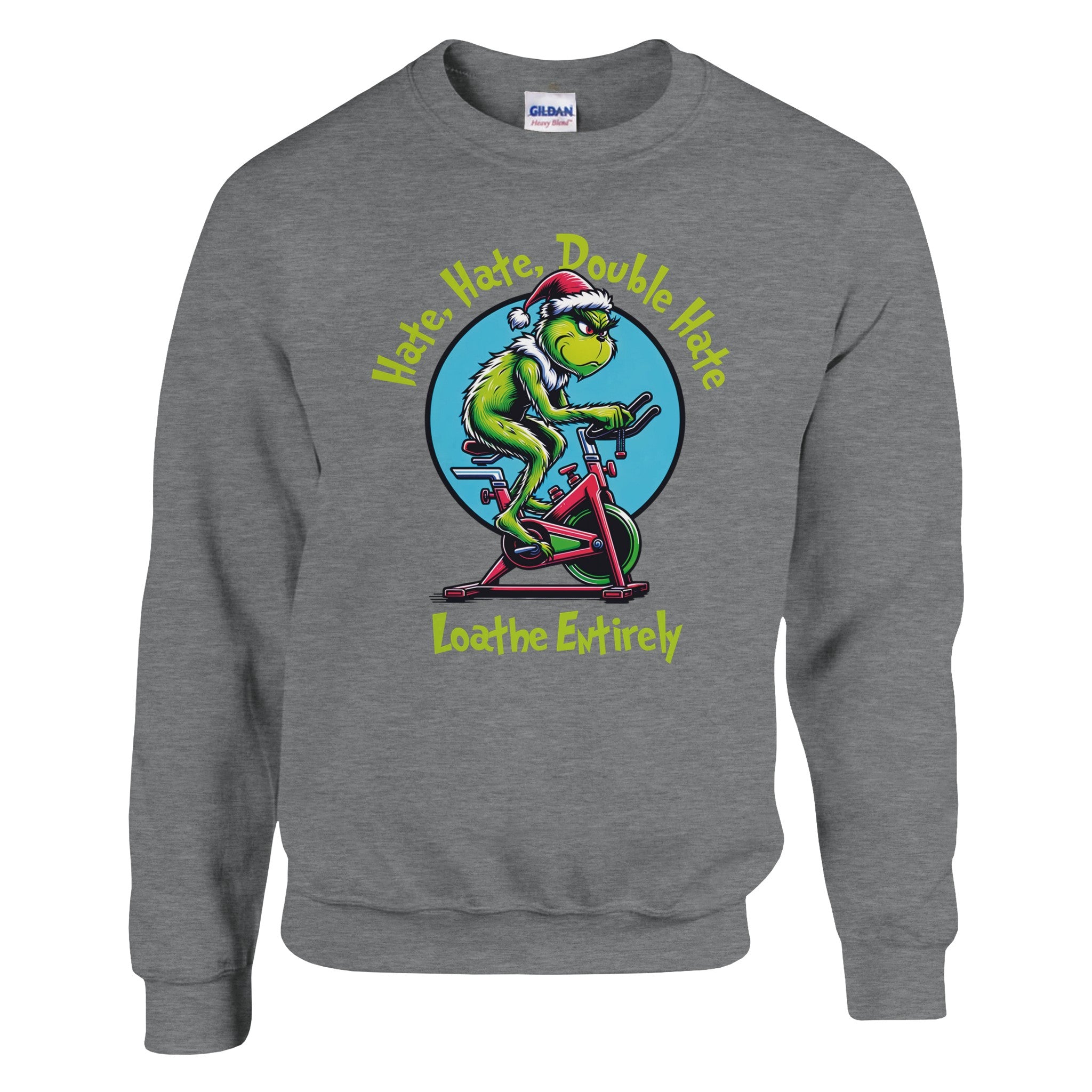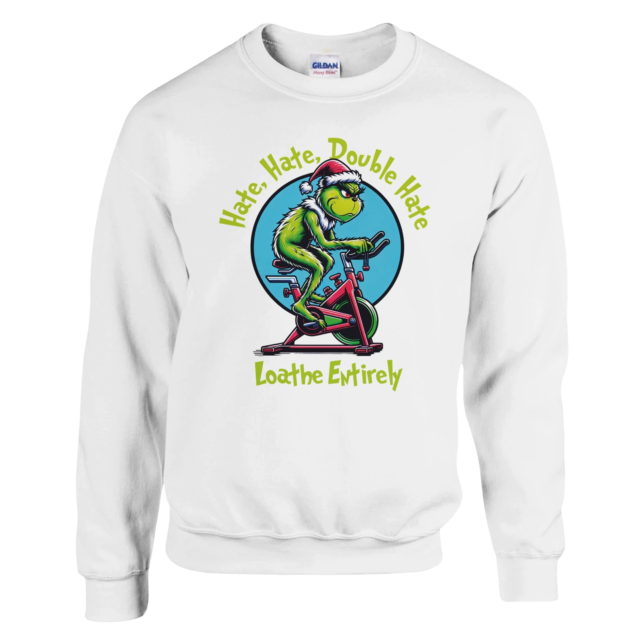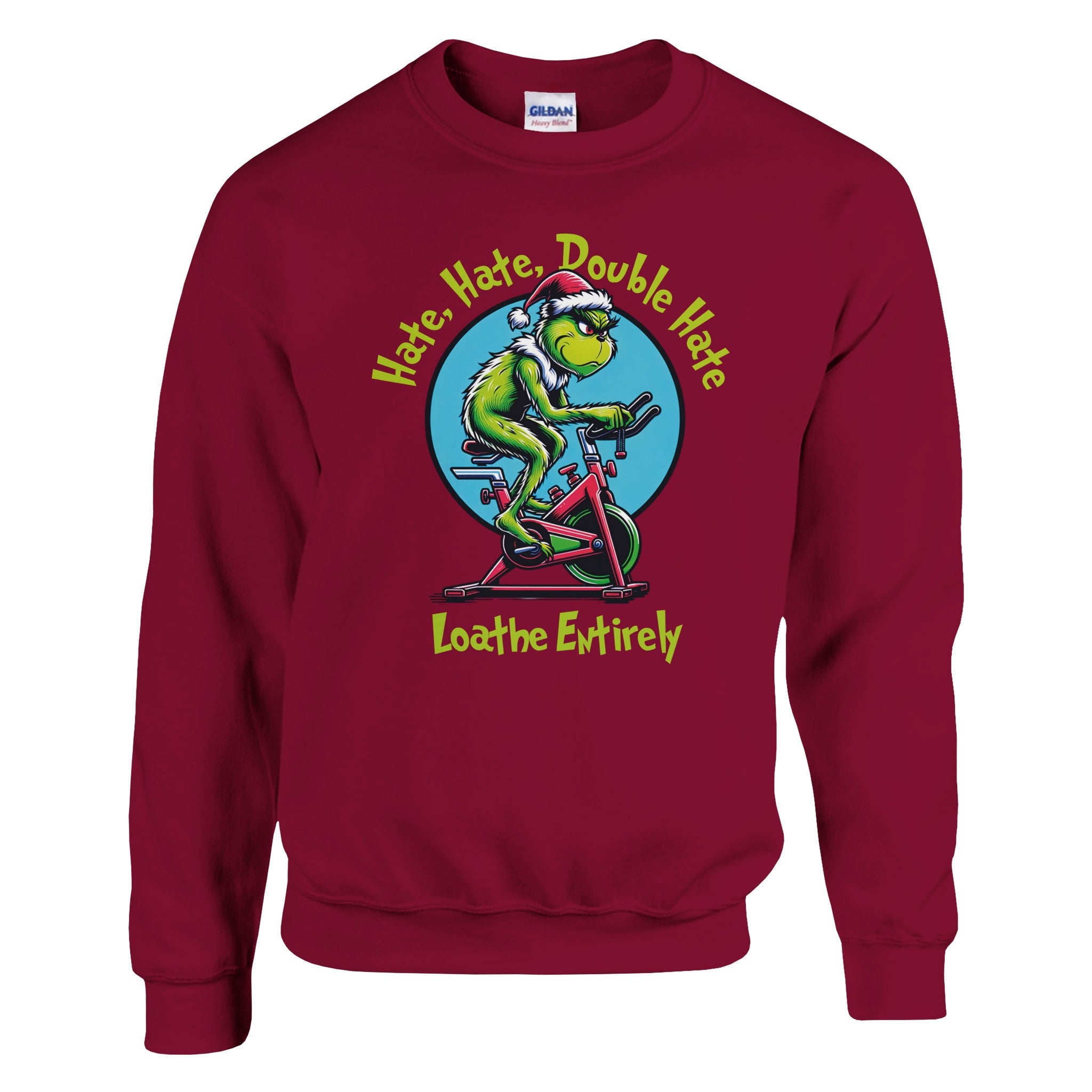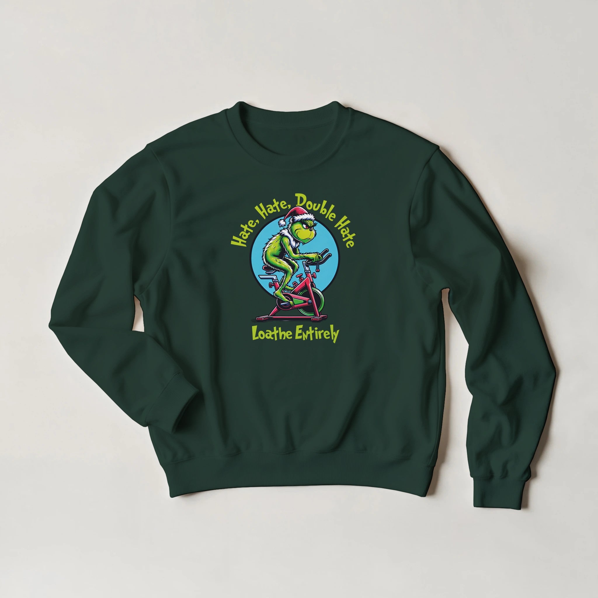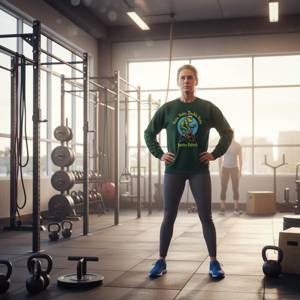 For everyone who despises cardio — this one’s for you. Our Hate Hate Double Hate Loathe Entirely tee features the Grinch himself mid–air bike meltdown, perfectly capturing the spirit of every lifter forced into endurance training. Designed in a vintage mid-century cartoon style, this holiday fitness shirt brings humor, rebellion, and relatable gym energy to your Christmas season.