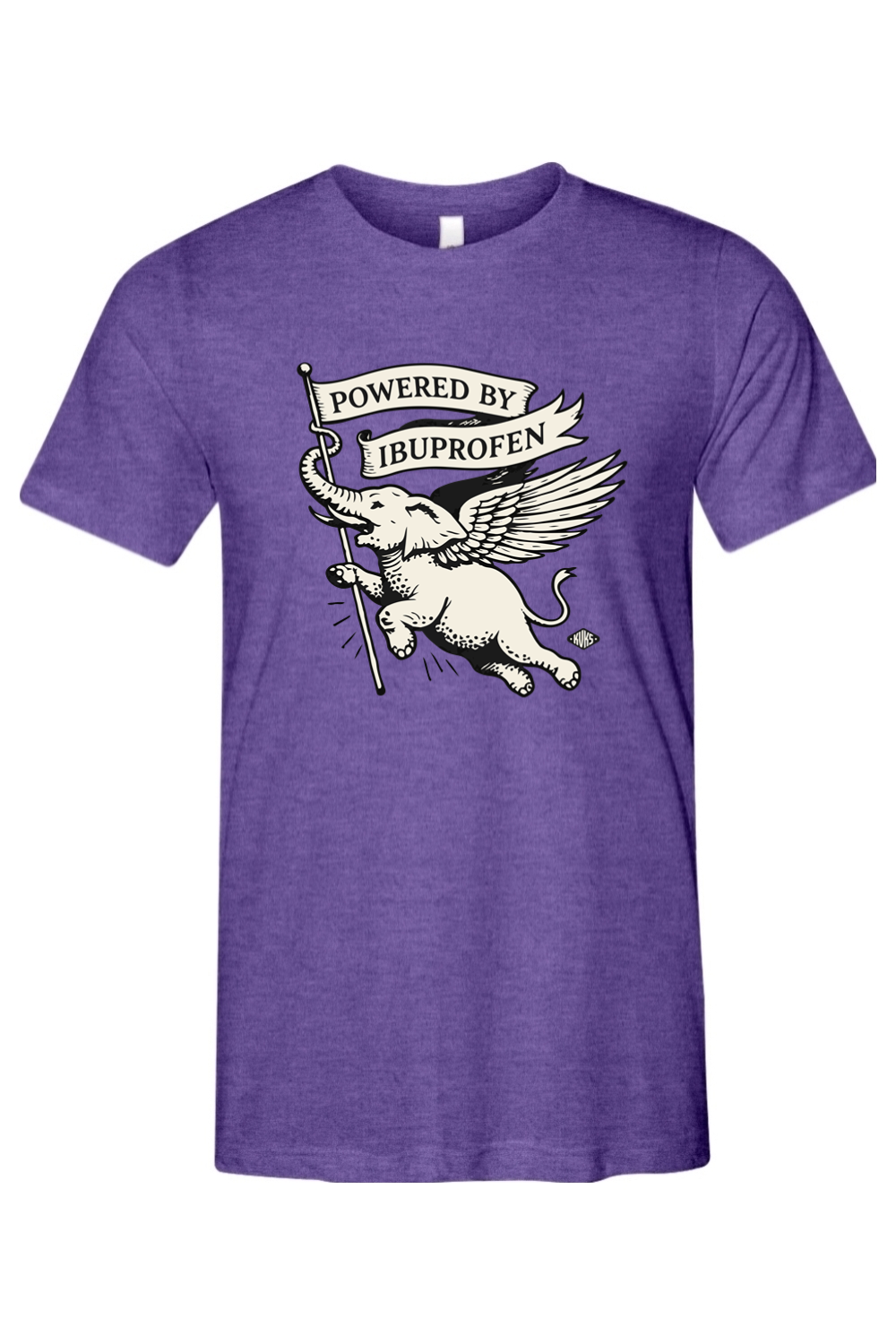 The Powered By Ibuprofen tee is for the lifters, movers, weekend warriors, and “I slept wrong and now my neck is broken” crowd. Vintage tattoo-style artwork. Winged animal energy. Banner flying proudly like a medieval warning sign that says: I’ve lived, and I’m still dangerous.